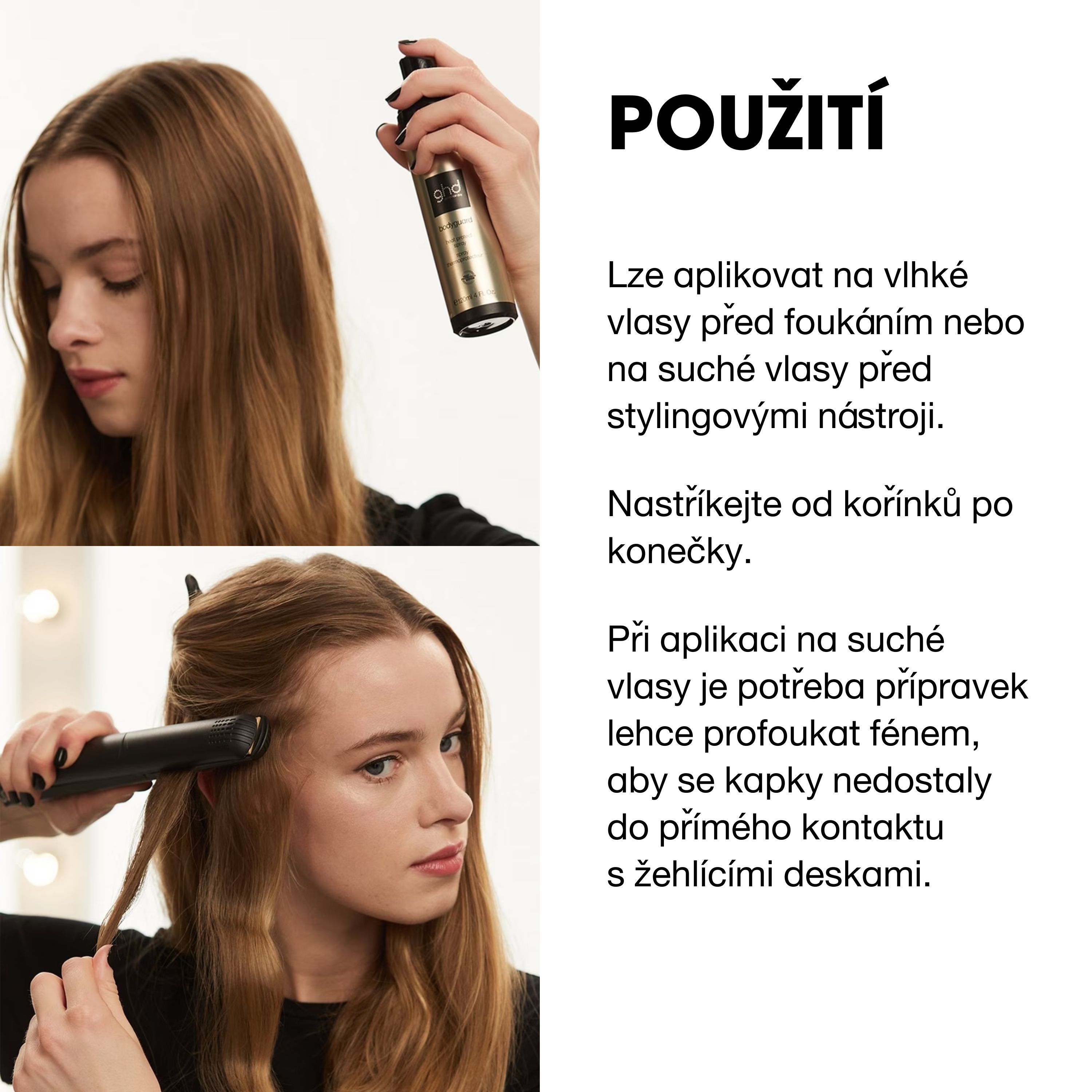 → Lze aplikovat na vlhké vlasy před fénováním i na suché vlasy před stylingem žehličkou/kulmou.