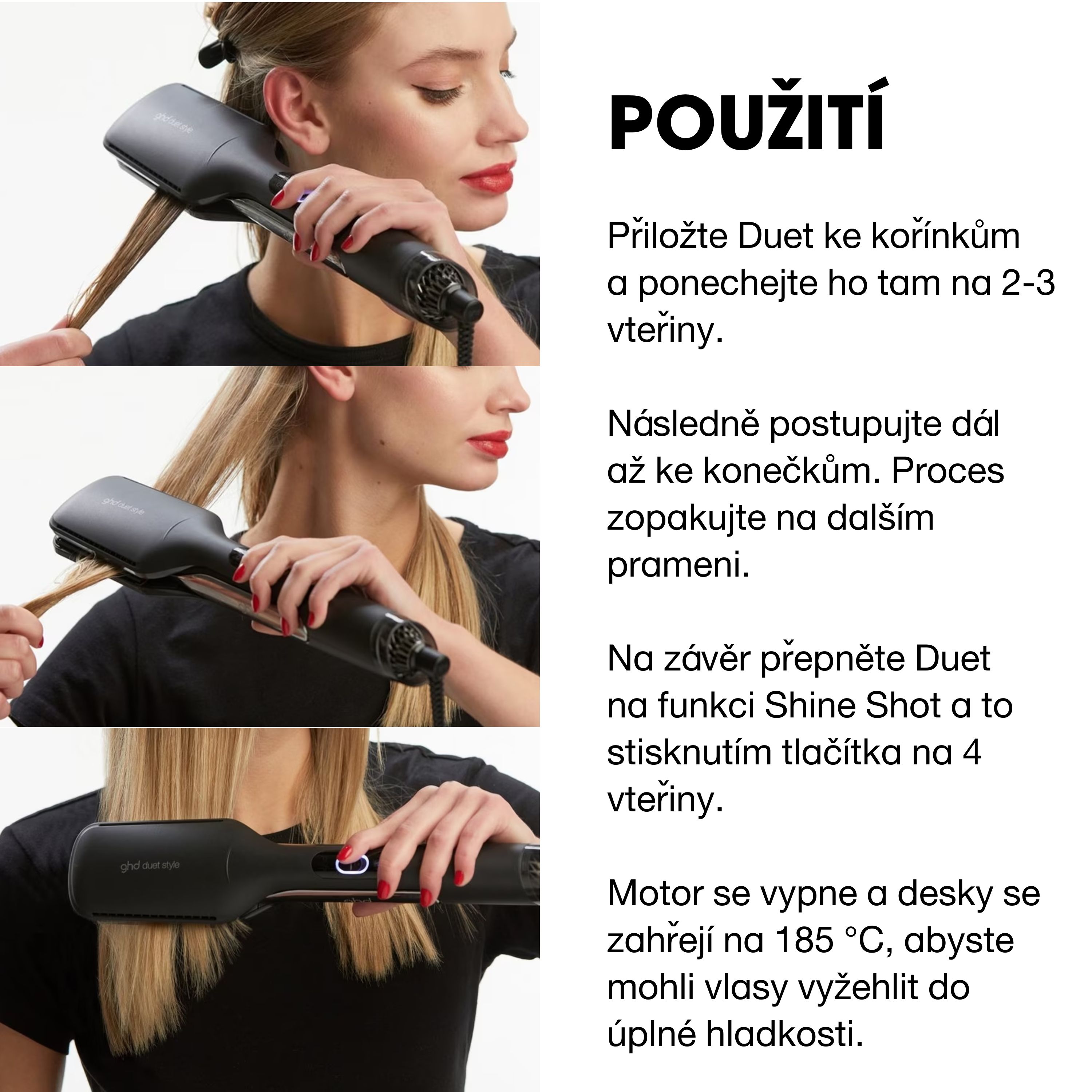 → Pro suché vlasy má speciální režim Shine Shot™, což je bezvzduchový režim s teplotou 185°, který se používá jako žehlička k dodání extra lesku a uhlazení již suchému účesu.