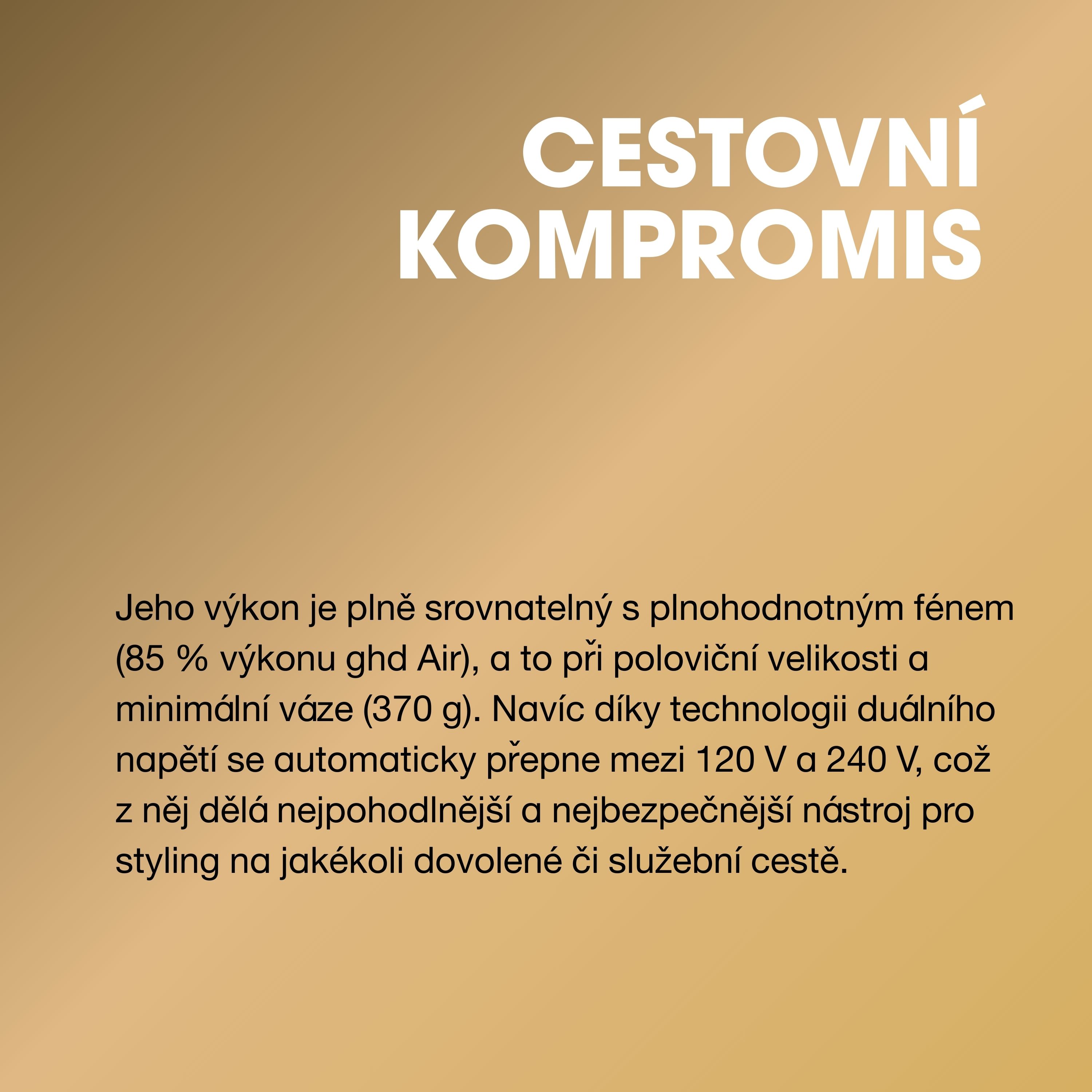 → Poskytuje 85 % výkonu fénu ghd Air, což zajišťuje rychlé a efektivní vysoušení i na cestách.