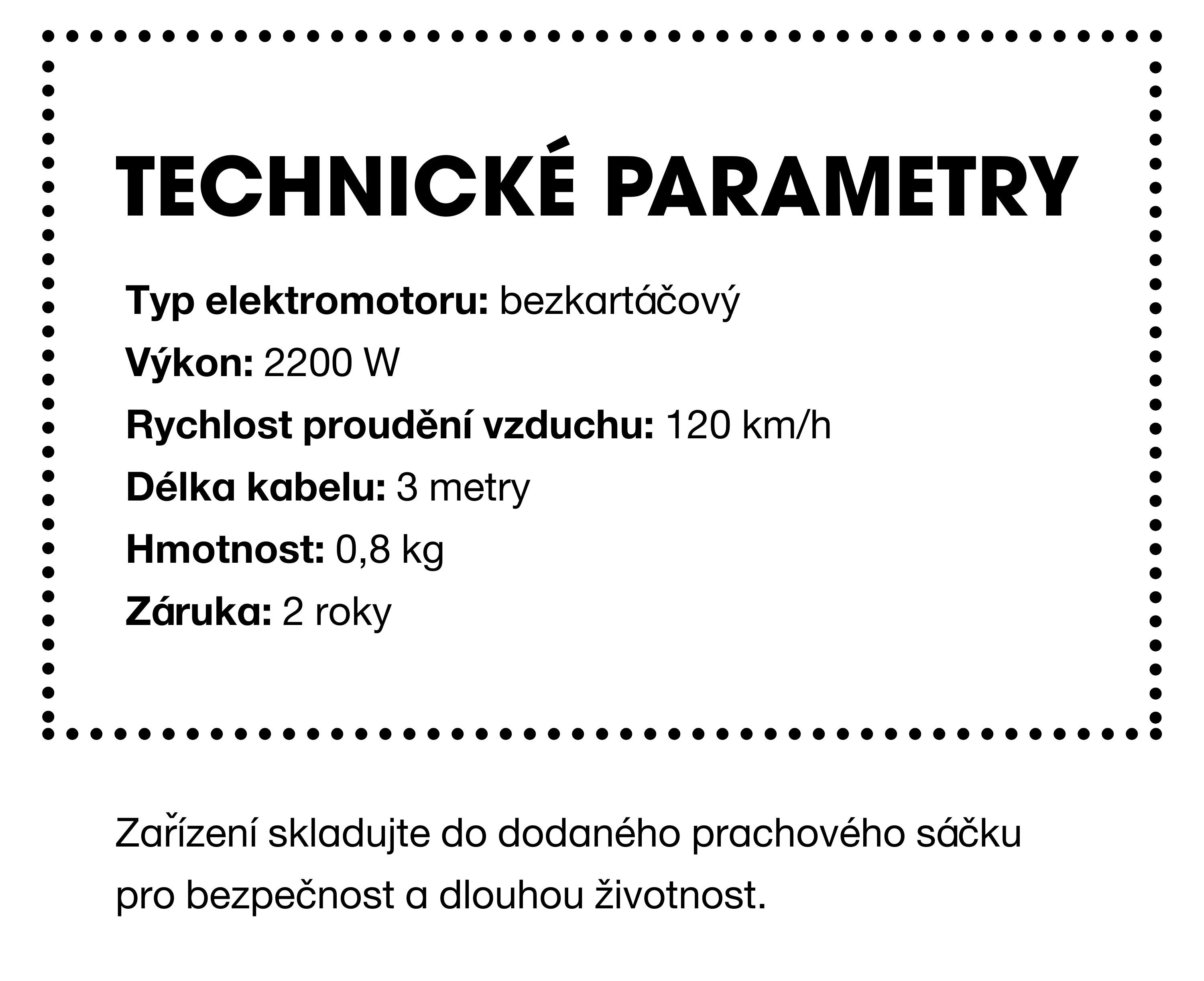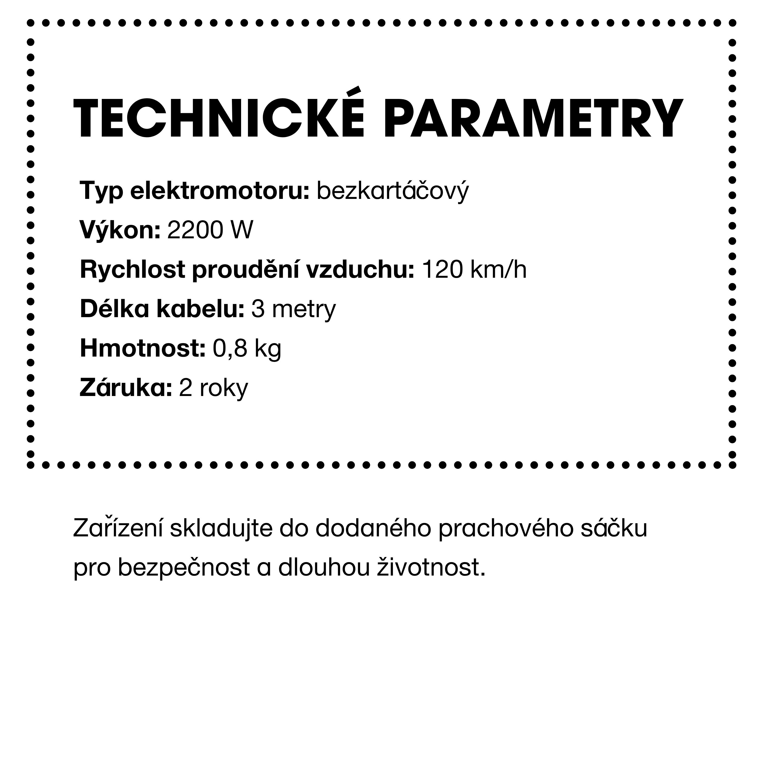 → Výkonný bezkartáčový motor s dlouhou životností generuje koncentrovaný proud vzduchu o rychlosti 120 km/h, což dramaticky zkracuje dobu vysoušení.