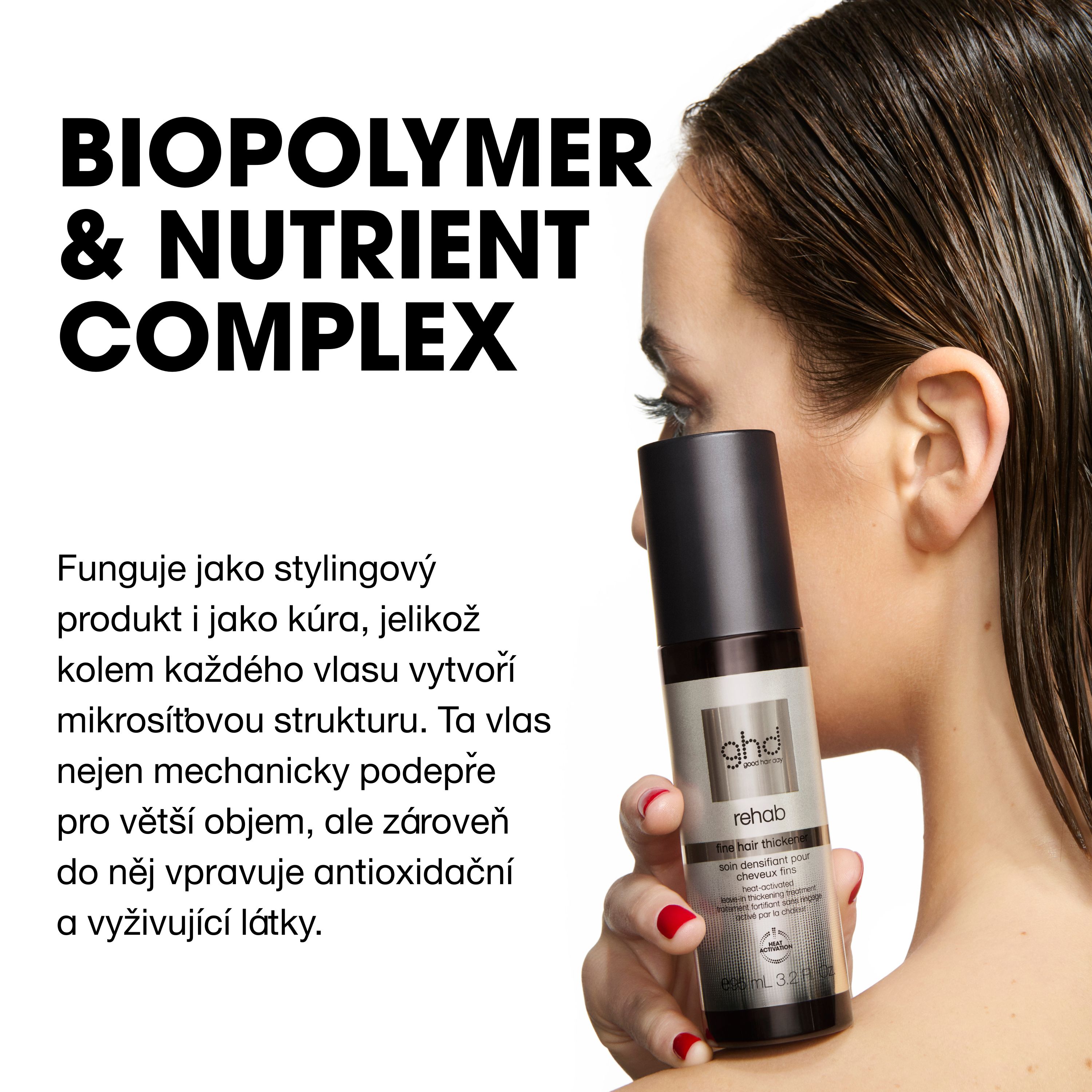 ghd Rehab Fine Hair Thickener Spray je lehký pečující a stylingový sprej navržený tak, aby dodal jemným vlasům okamžitý pocit hustoty, objemu a plnosti. Na rozdíl od běžných objemových produktů vlasy nezatěžuje ani nezanechává lepivý film – místo toho vytváří dojem přirozeně silnějších vlasů od kořínků až ke konečkům.