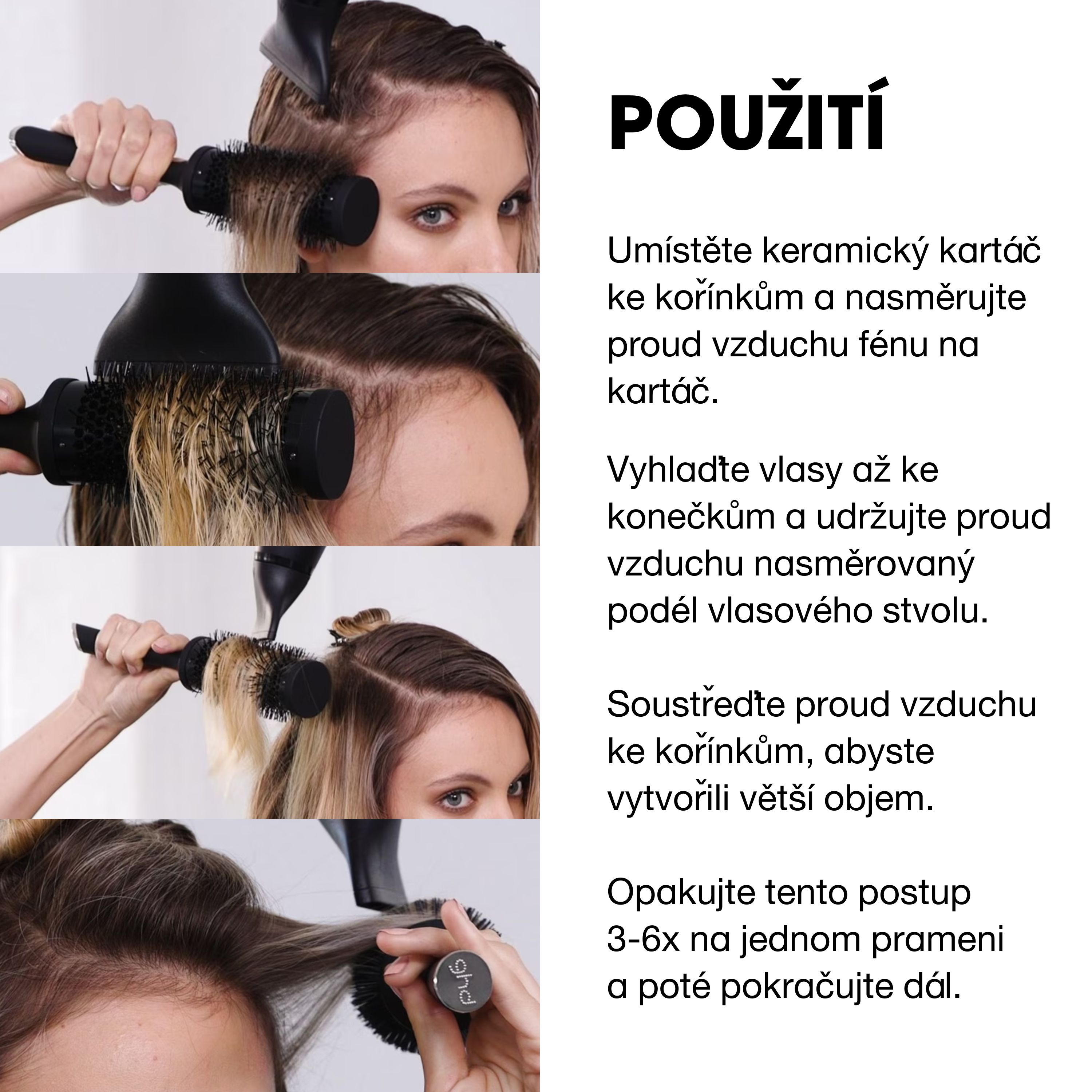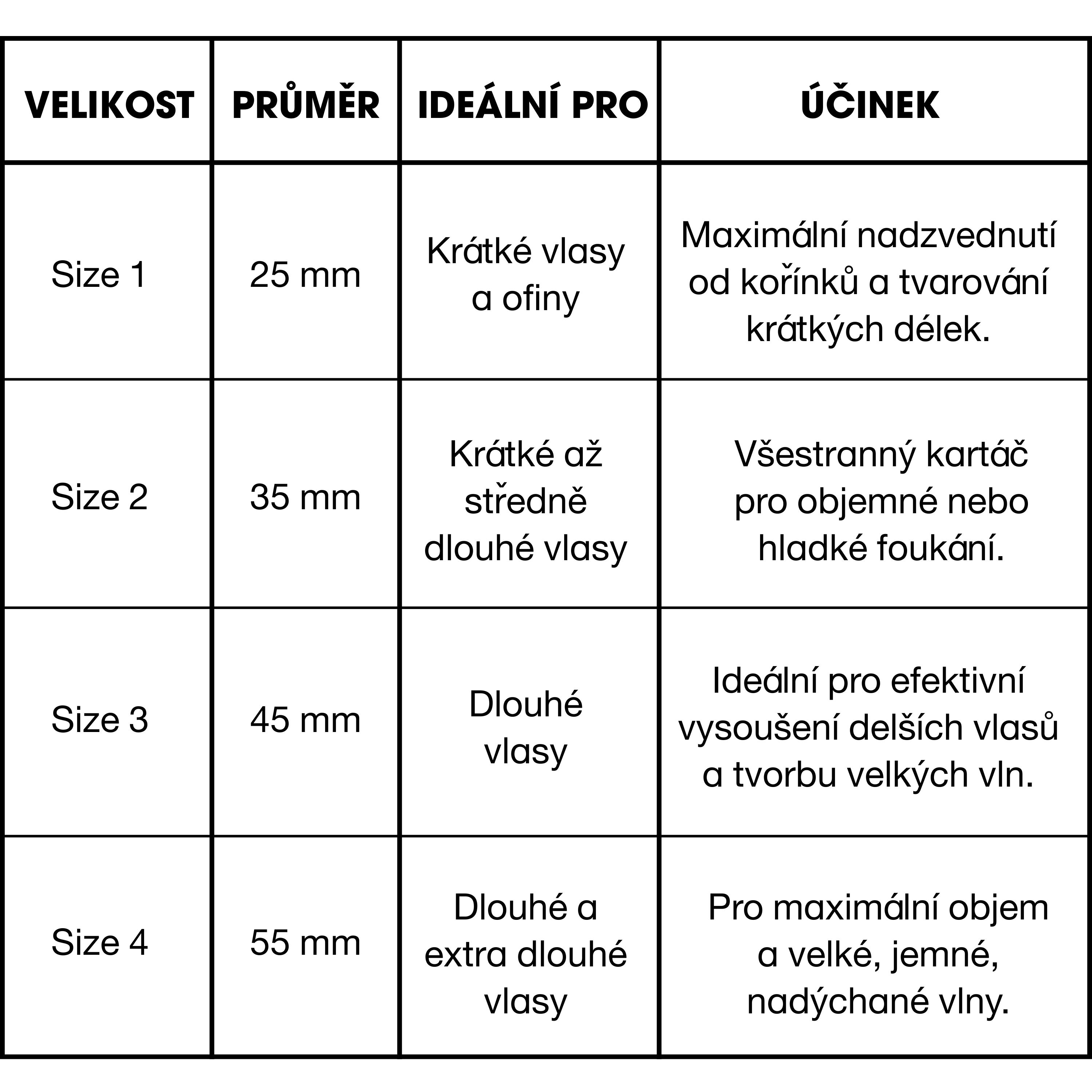 Kartáč je dostupný ve čtyřech různých velikostech, které jsou přizpůsobeny různým délkám vlasů a požadovanému efektu.