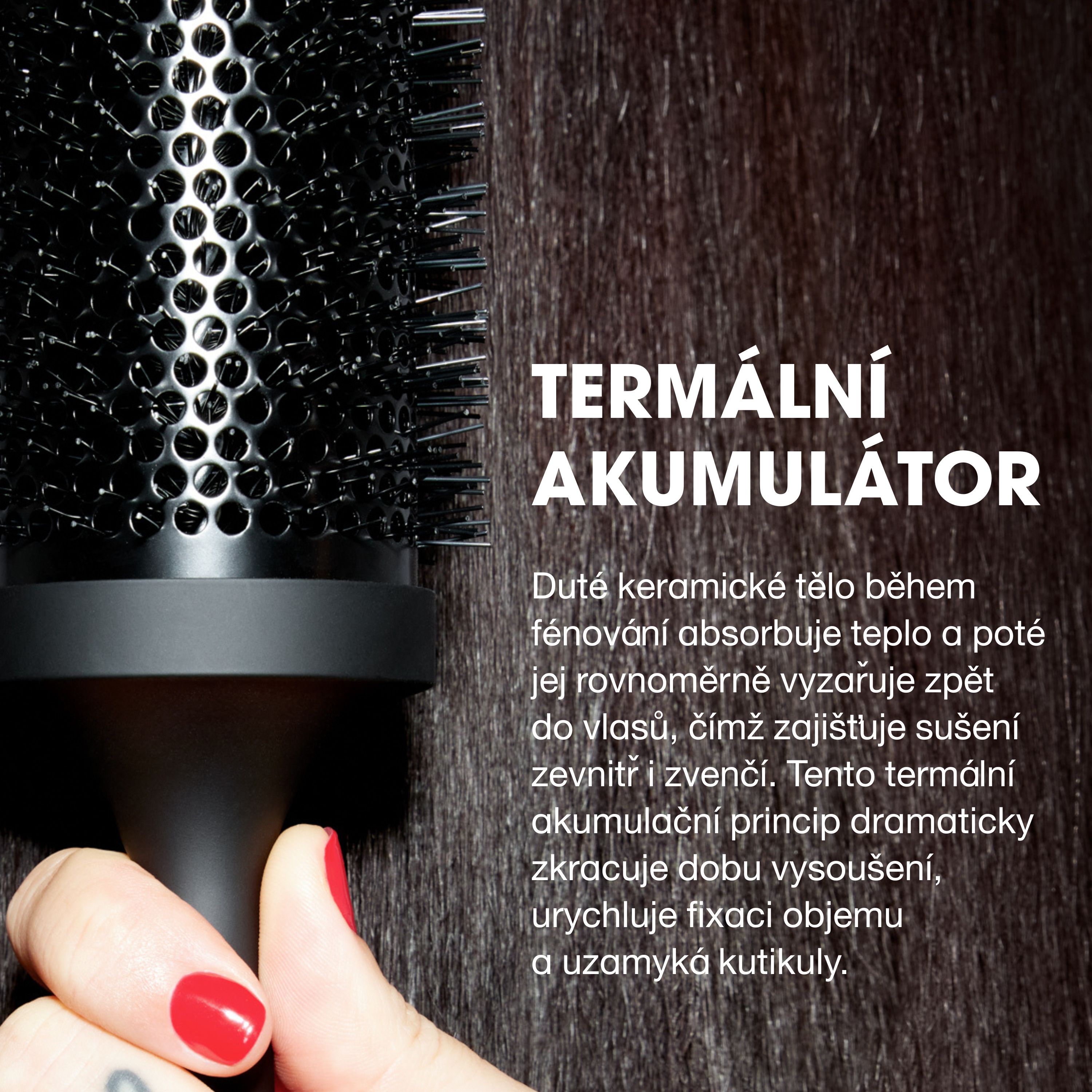 → Duté, keramické tělo zadržuje teplo z fénu a rovnoměrně ho distribuuje, což urychluje celý proces foukání.