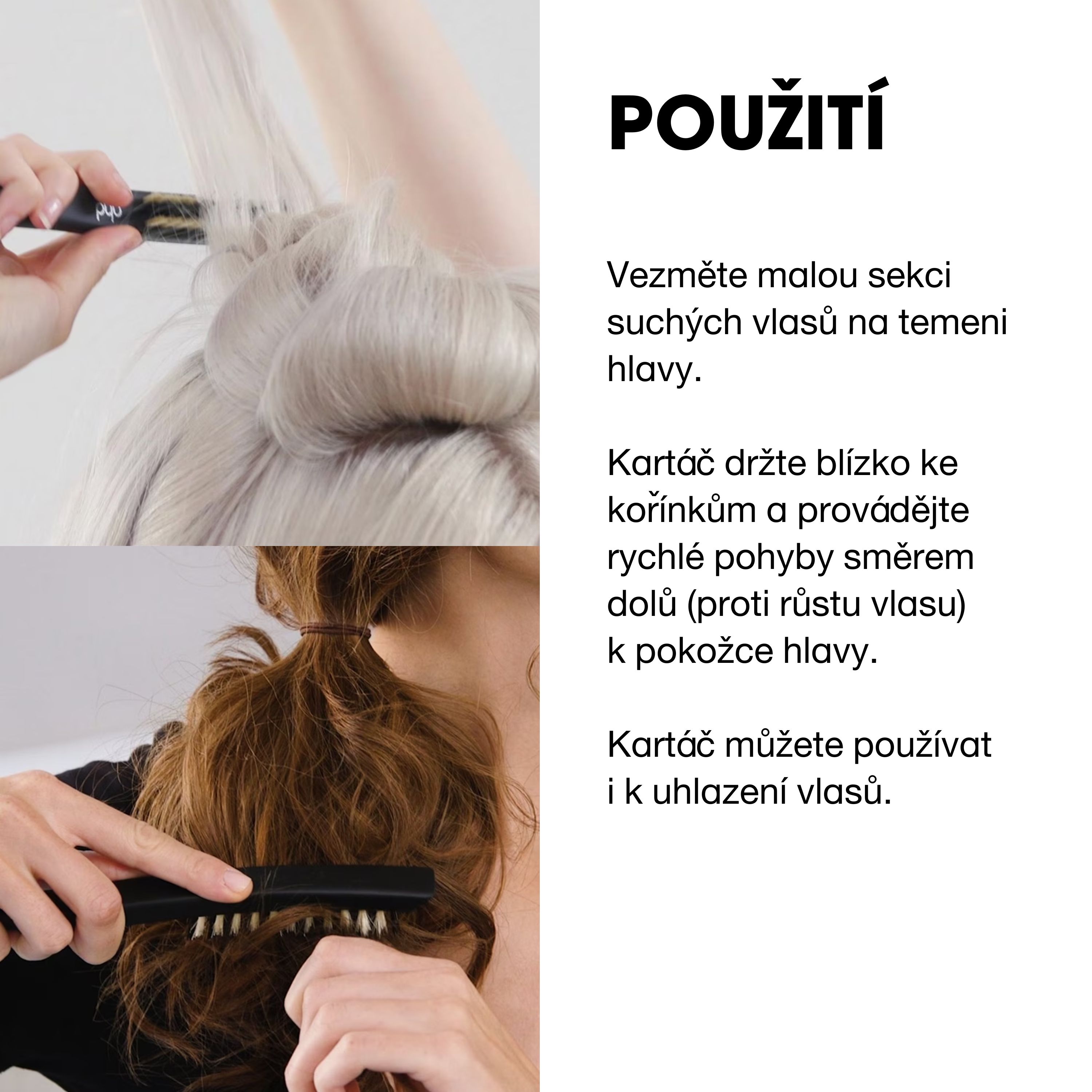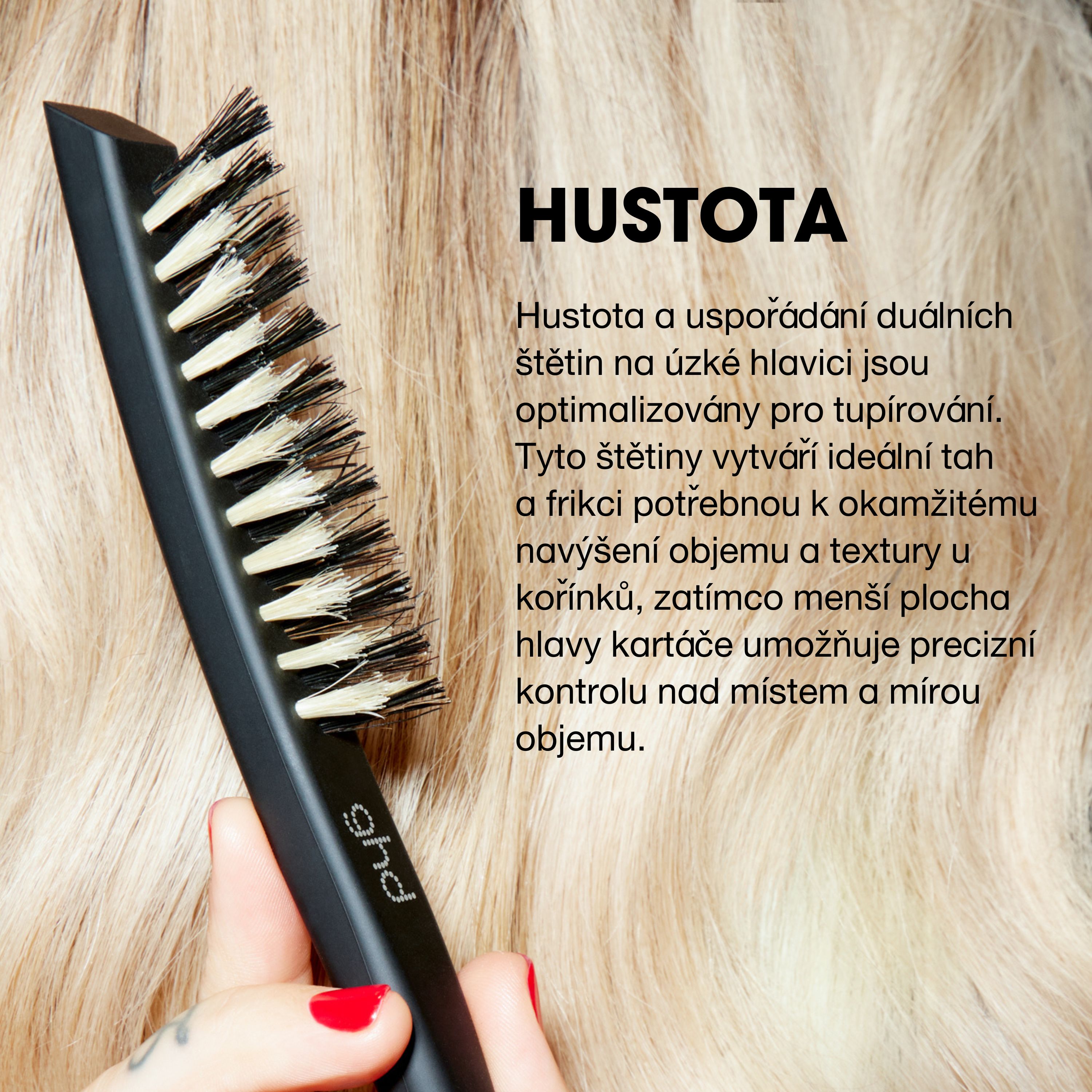 → Úzká hlavice a husté štětiny umožňují kontrolované a efektivní tupírování (drásání) u kořínků, které dodá účesu dlouhotrvající objem a oporu bez poškození vlasů.