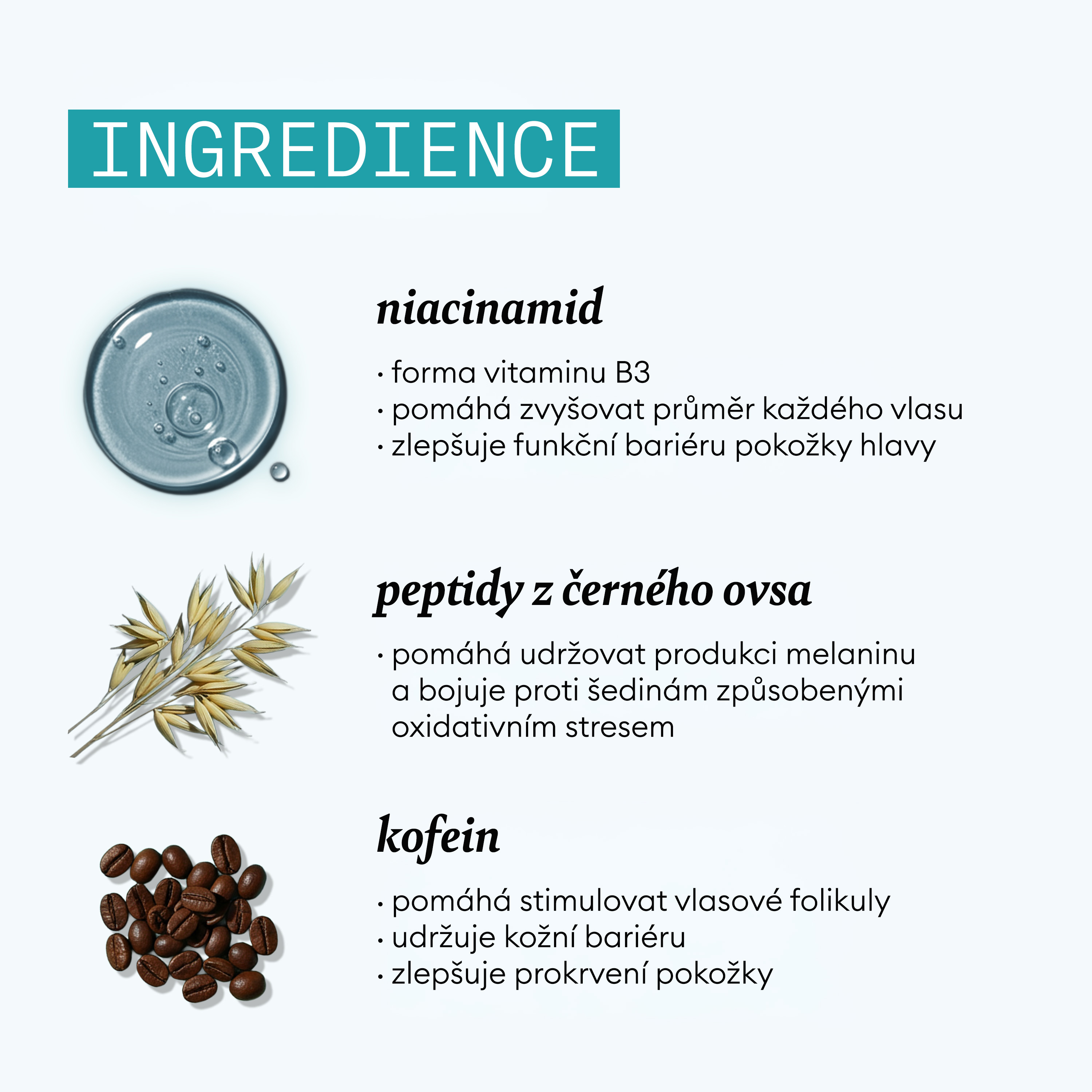 → Kofein stimuluje vlasové folikuly a při vmasírování zlepšuje mikrocirkulaci krve v pokožce hlavy, čímž udržuje kožní bariéru v kondici.