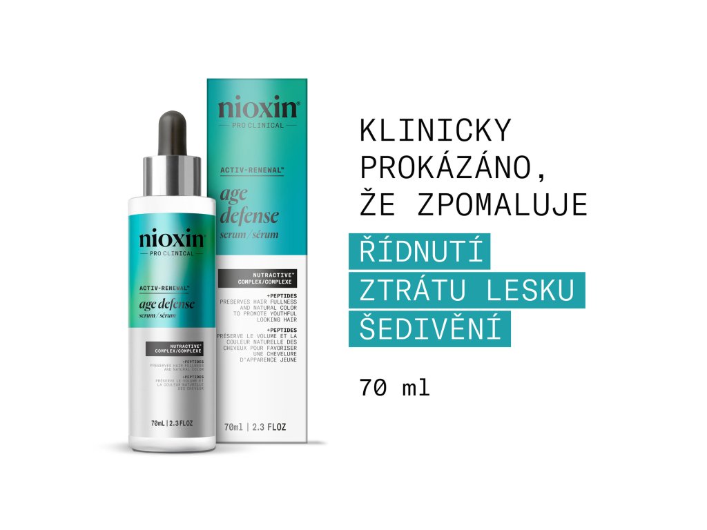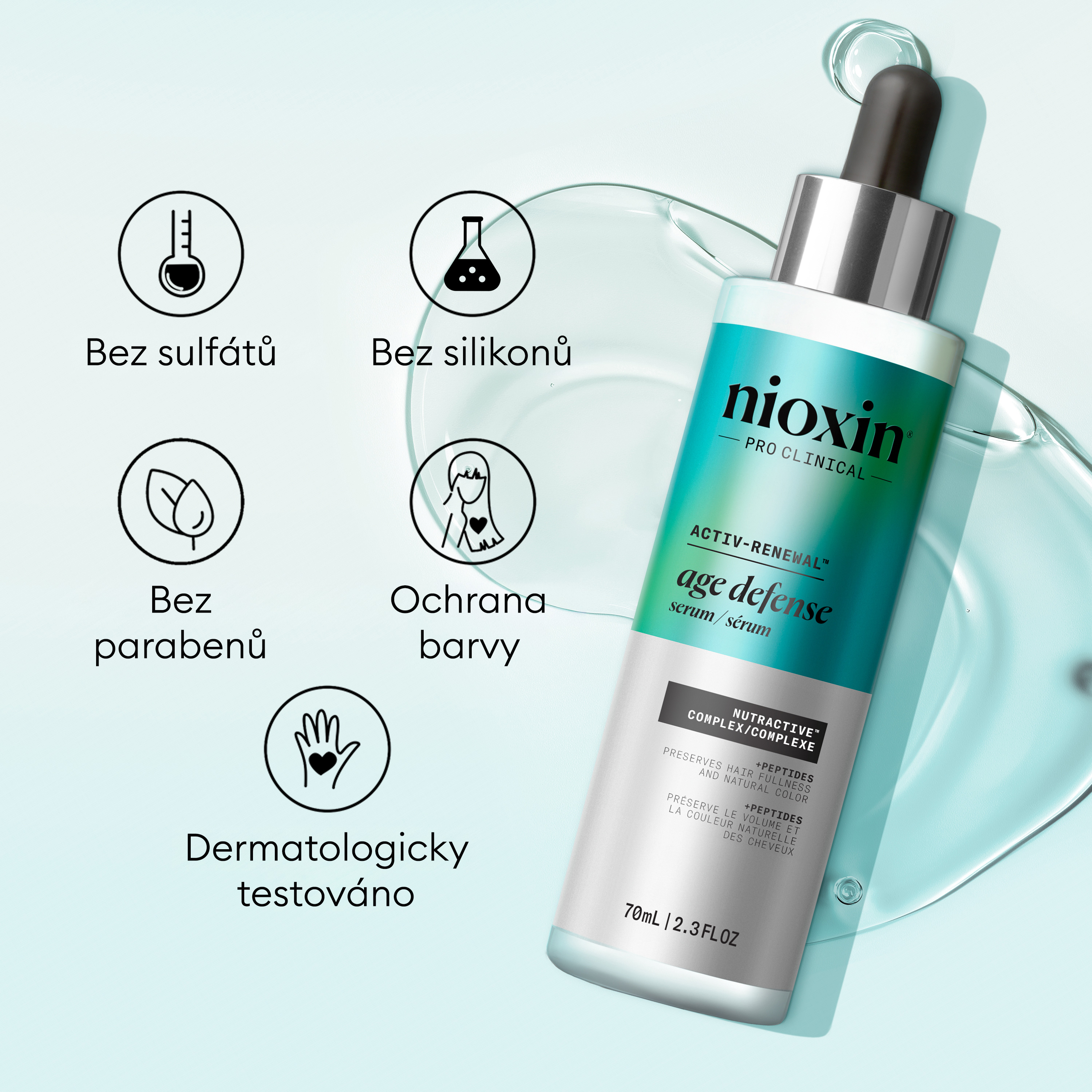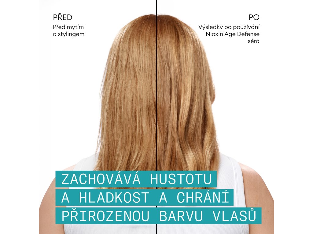 Nioxin Age Defense Serum je lehké bezoplachové sérum na pokožku hlavy, které viditelně zmírňuje známky stárnutí vlasů, jako je řídnutí, matnost, krepatění, drsná textura a šedivění. Toto sérum představuje závěrečný krok režimu Age Defense, který nabízí 360° přístup k udržení mladistvého vzhledu a hustoty vlasů.