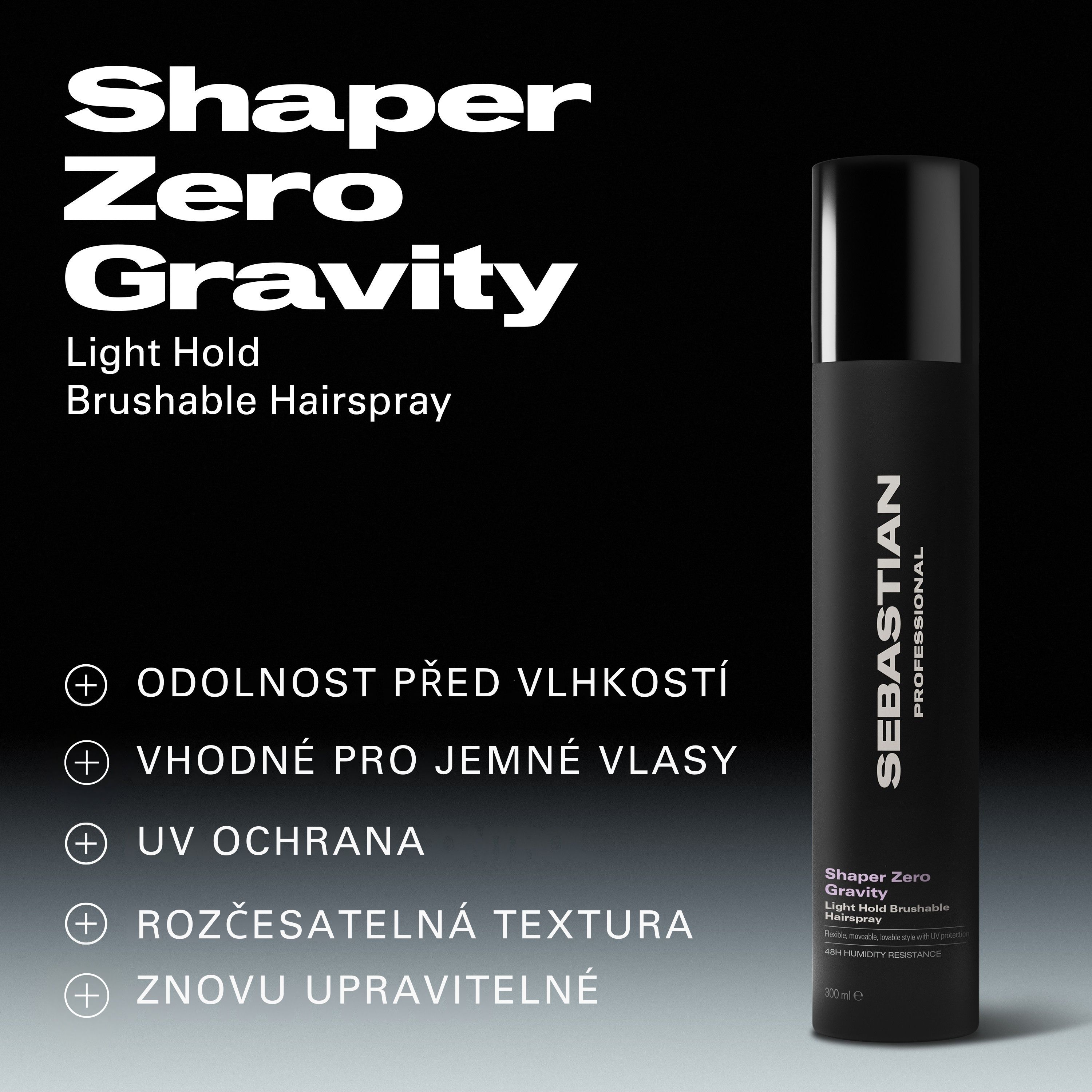 Poznejte Shaper Zero Gravity Lightweight Control Hairspray, ultralehký lak na vlasy od Sebastian Professional, který vám poskytne flexibilní kontrolu a objem s pocitem, že na vlasech nemáte vůbec nic.