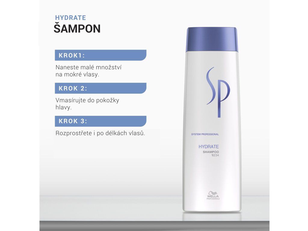 Řada Wella Professionals SP Hydrate se speciálním aktivním zvlhčujícím komplexem Active Moisture Complex poskytuje vlasům dlouhotrvající hydrataci a aktivní ochranu proti vysušení. S obsahem Glycerinu, D-Panthenolu, což jsou látky, které se zakotví hluboko ve vlase a poskytnou dlouhotrvající vlhkost.