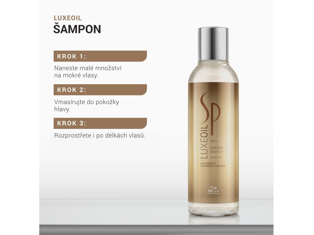 Produkty řady LuxeOil jsou obohaceny o tři pečující oleje* a hydrolizovaný keratin. Arganový olej zajišťuje výživu vlasu, mandlový olej udržuje dostatečnou hydrataci a jojobový olej pečuje o poškozené konečky. Řada je ikonická svou vůní, která je výraznější než u jiných řad produktů Wella Professionals SP.