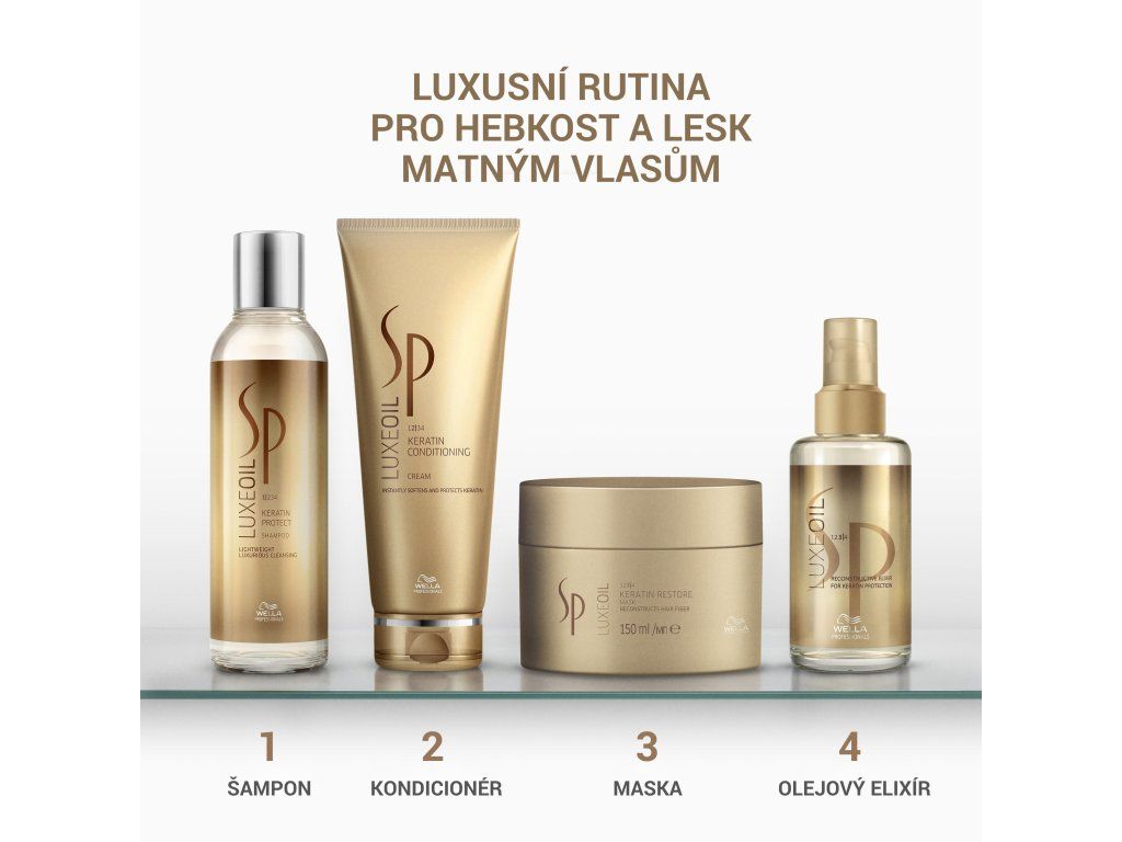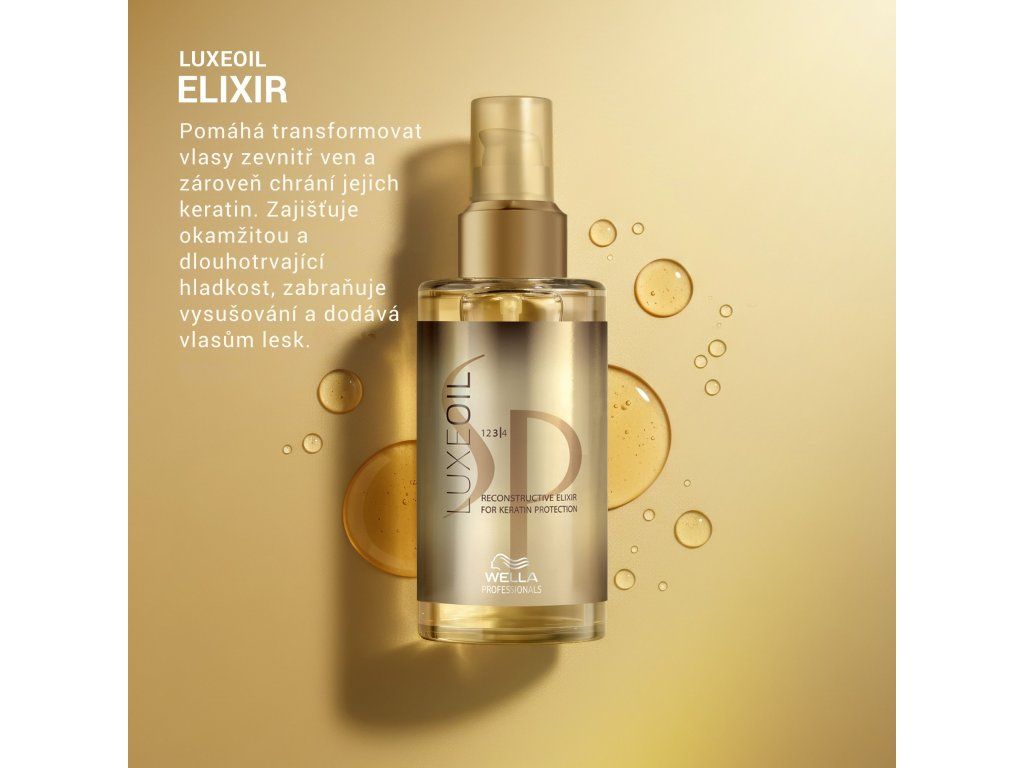 Produkty řady LuxeOil jsou obohaceny o tři pečující oleje* a hydrolizovaný keratin. Arganový olej zajišťuje výživu vlasu, mandlový olej udržuje dostatečnou hydrataci a jojobový olej pečuje o poškozené konečky. Řada je ikonická svou vůní, která je výraznější než u jiných řad produktů Wella Professionals SP.